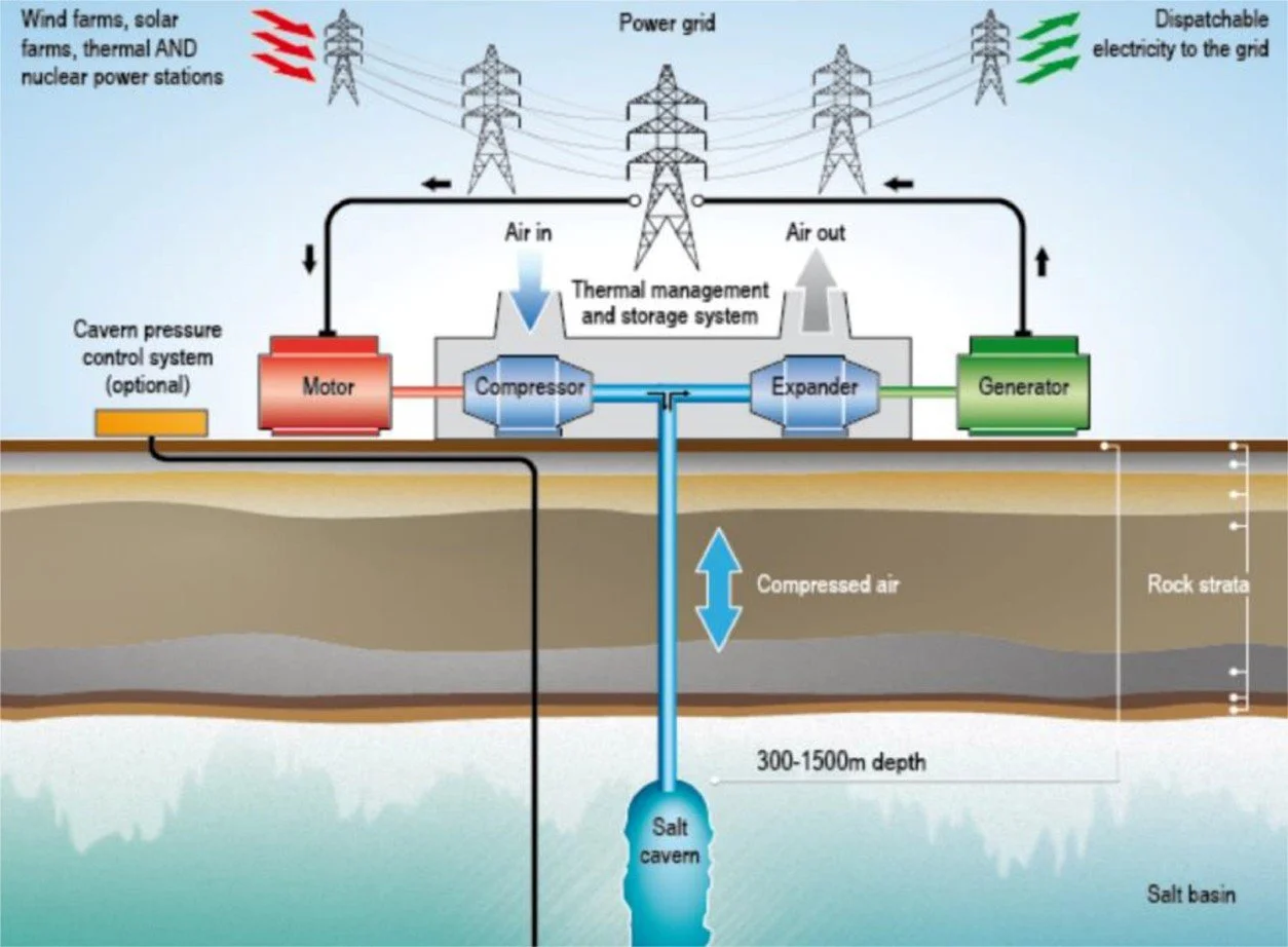 Compressed air energy storage (CAES) is a mechanical, long duration energy storage technology that stores energy by compressing air and injecting it into subterranean caverns. When electricity is needed, the stored air is released, expanded through a turbine, and converted back into electrical power.